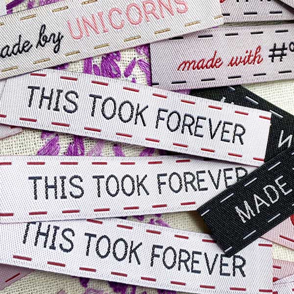 The original "This Took Forever™" woven labels! Affix these to your handmade projects and let them know it wasn't just made it with love, it also took forever to make. There are four woven labels per pack.