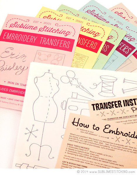 Each set of iron-ons appears on an 8 1/2" x 11" sheet and includes complete instructions for how to transfer the designs onto fabric. I've also included a quick embroidery how-to! All designs are shown.