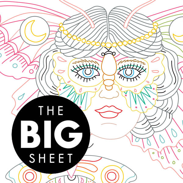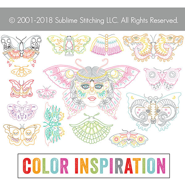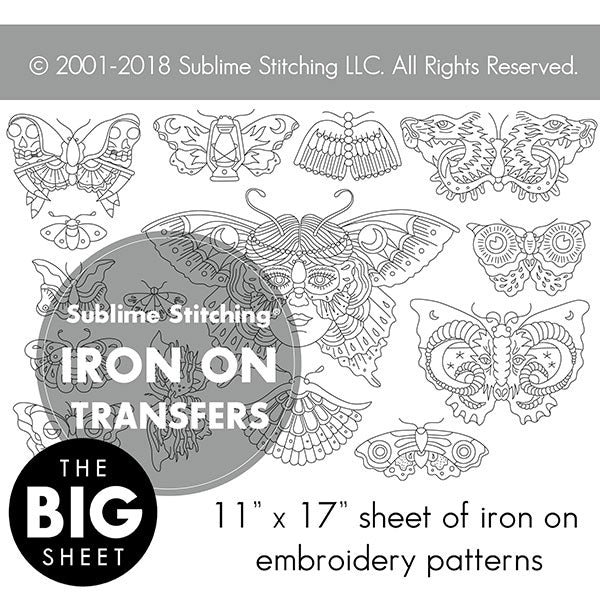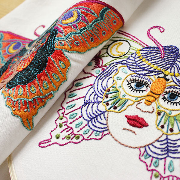 Kyler Martz is an illustrator and tattoo artist whose work blends traditional flash in a not-so traditional way. This is my second collection of embroidery patterns with Kyler, on a BIG sheet. For reference: the butterfly woman will fit inside a 10" hoop.