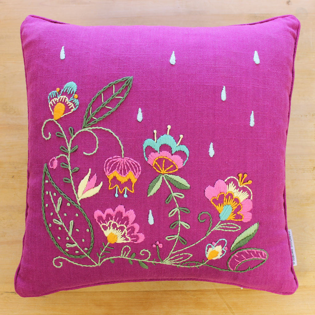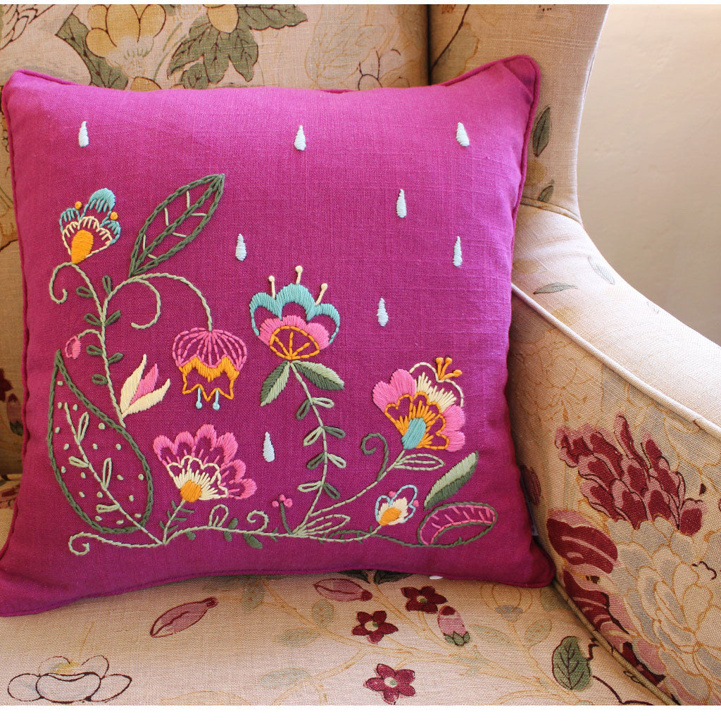 "Oscar's Bouquet" is a vibrant hand embroidery design by Jenny Hart printed on a finished, linen-blend pillow cover. One side of the cover is zippered, and no sewing is necessary! Pop in your favorite embroidery hoop and start embroidering right away. The backside of the pillow is blank, so you can make it a reversible pillow with your own design!