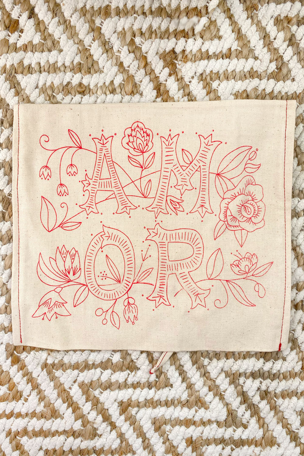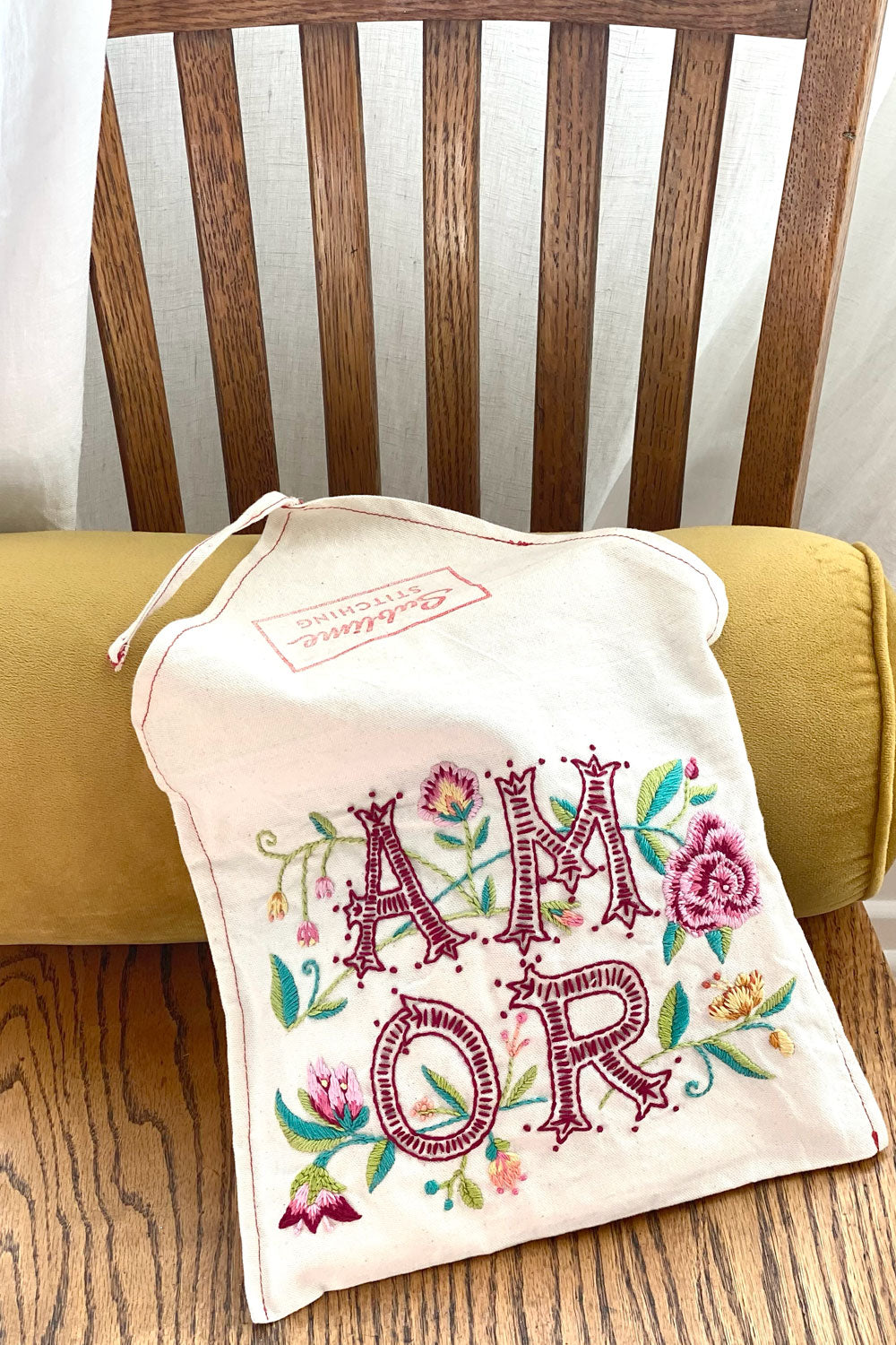 - "Amor" pre-printed design on envelope-style bag with tie closure (bags are cut and sewn by one person in Pakistan, allow for imperfections).