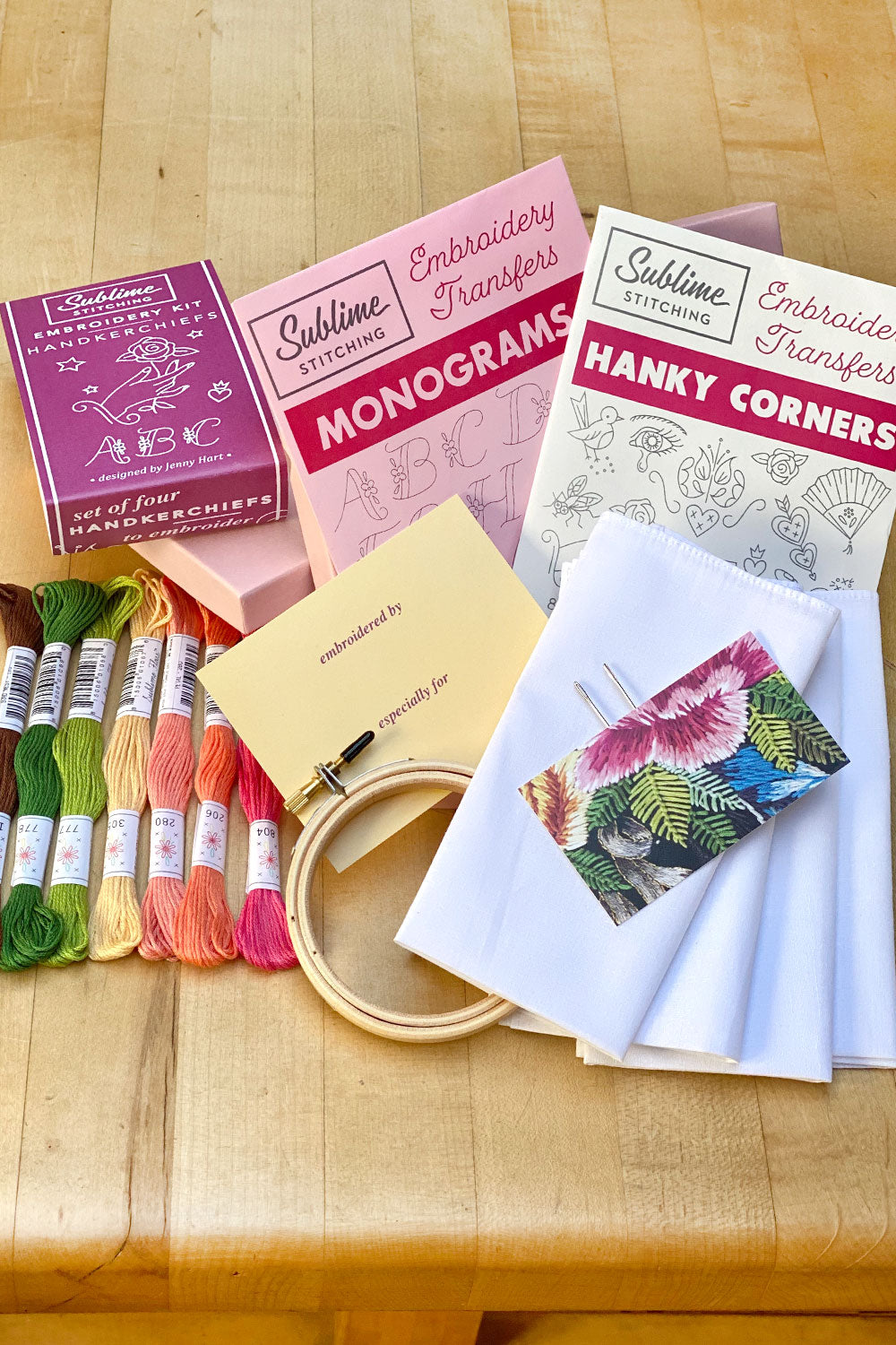So simple and sweet! The Sublime Stitching Monogram Embroidery Kit for embroidering your own set of handkerchiefs. Make them for yourself, stitch them for a loved one (includes an "embroidered by" card) or give the kit itself as a gift. The pink box can live on for their storage, or storage of other embroidery supplies.